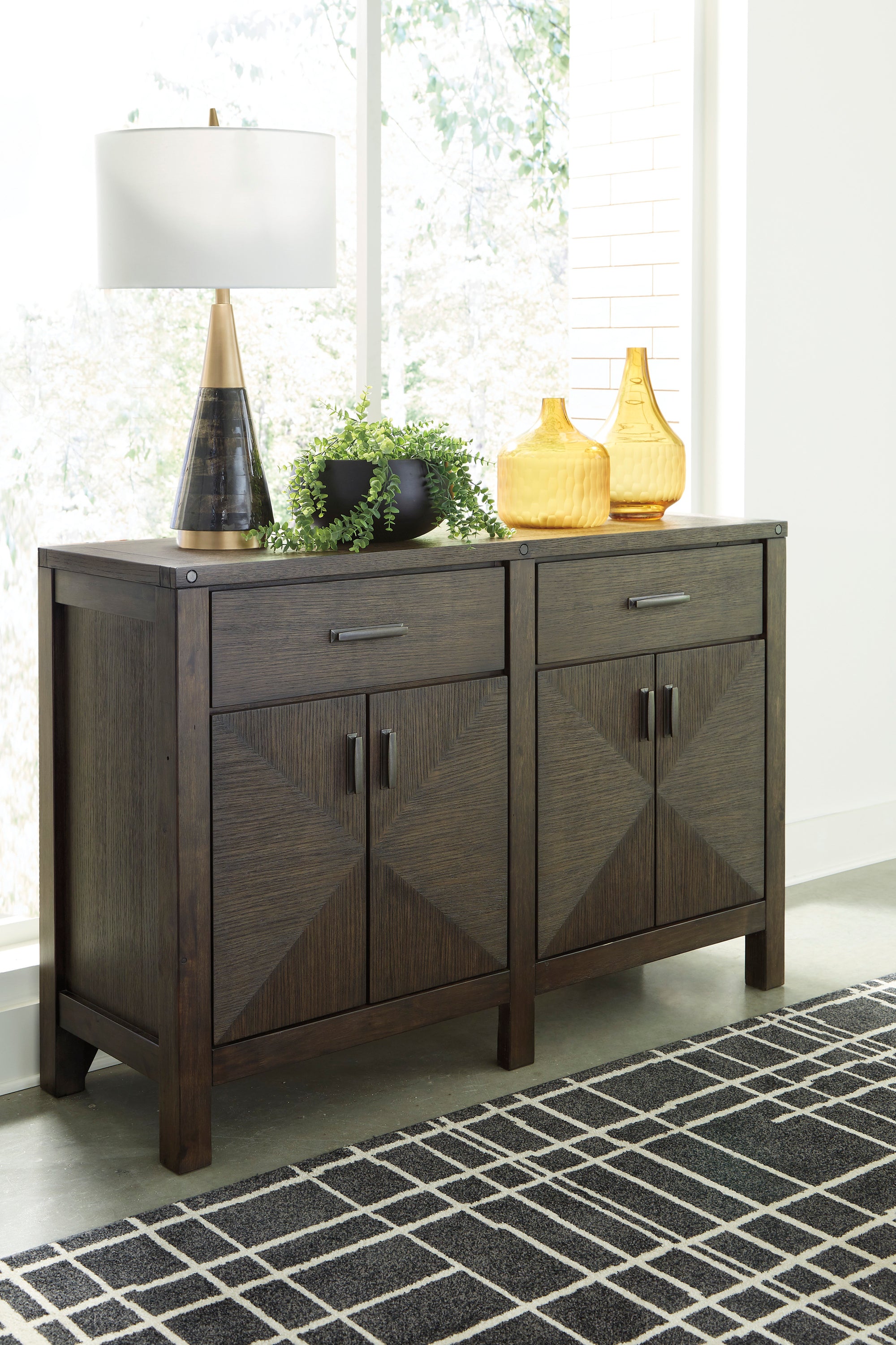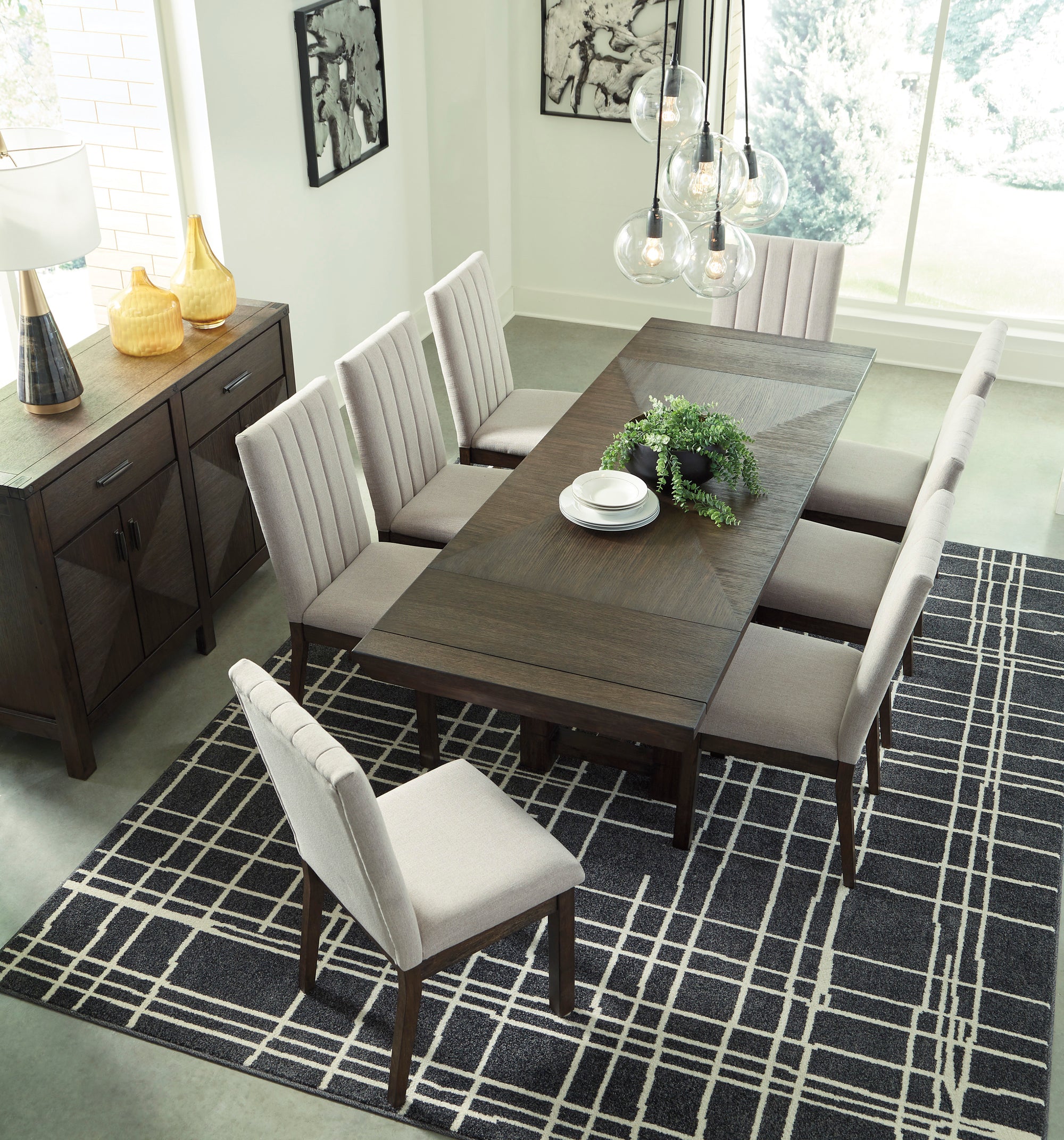 Table top with diamond matched veneer inlay is set on a sturdy four post trestle base. Two removable leaves for extra seating capacity. Solid wood chair frames with fully upholstered seat and back. Server features two fully finished drawer boxes with ball bearing side glides and two lower cabinets with an adjustable shelf in each. Metal bar pulls with back plate are finished in a forged steel color. Matching inset bolt heads accentuate the through tennon look of the server top fra