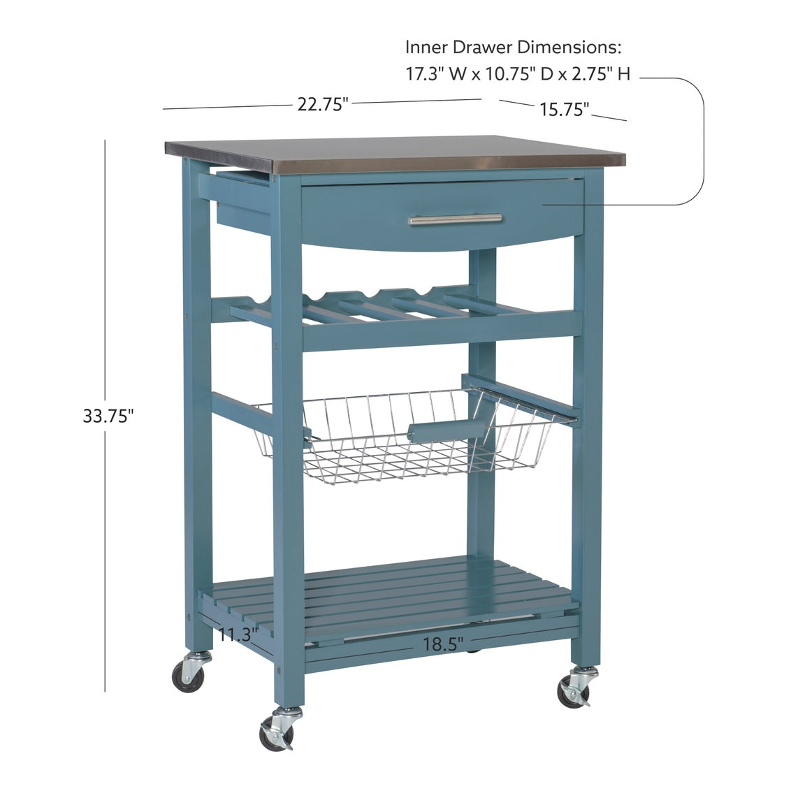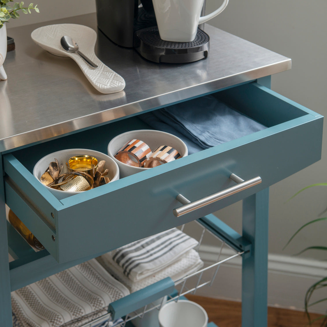 Keep produce fresh in a pull out wire basket. The food safe, stainless steel top, suitable for a coffee maker or compact microwave, is easy to maintain. This farmhouse style cart gives a fresh appeal to any kitchen or entertainment setting. It glides wherever you need it on durable, locking casters, making your life easieR