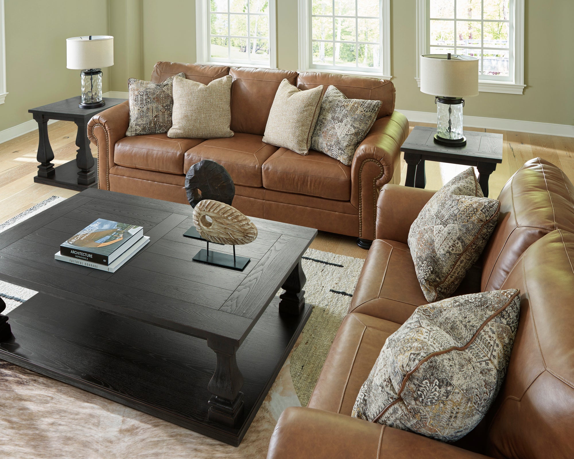 Upgrade your living space with this quality sofa. The traditional motifs and modern hue provide a transitional design, while the nailhead trim and accent pillows add a touch of flair. With high-resiliency foam cushions and genuine leather covering, this sofa offers both comfort and luxurious style