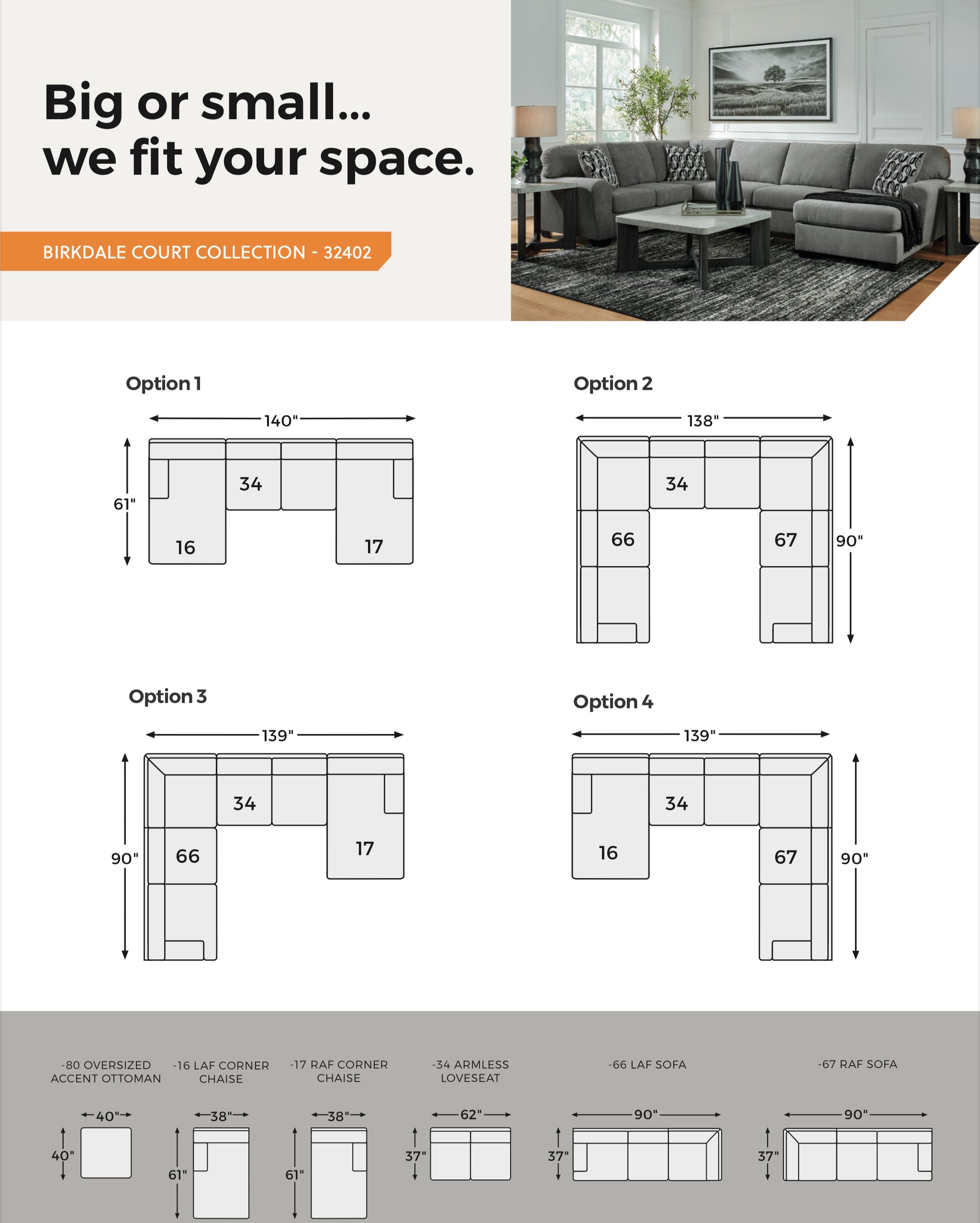 Includes 3 pieces: left-arm facing sofa, armless loveseat and right-arm facing corner chaise