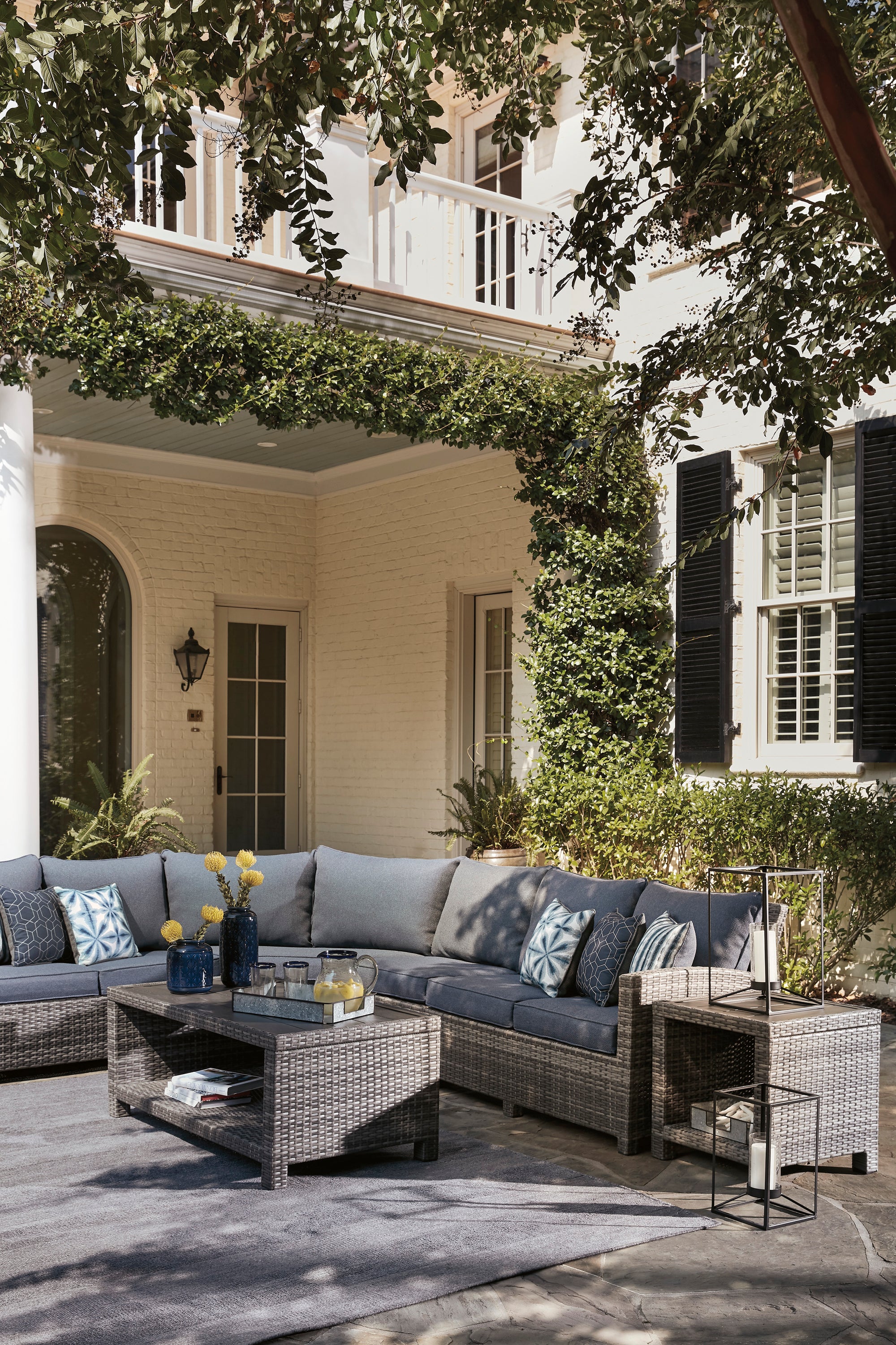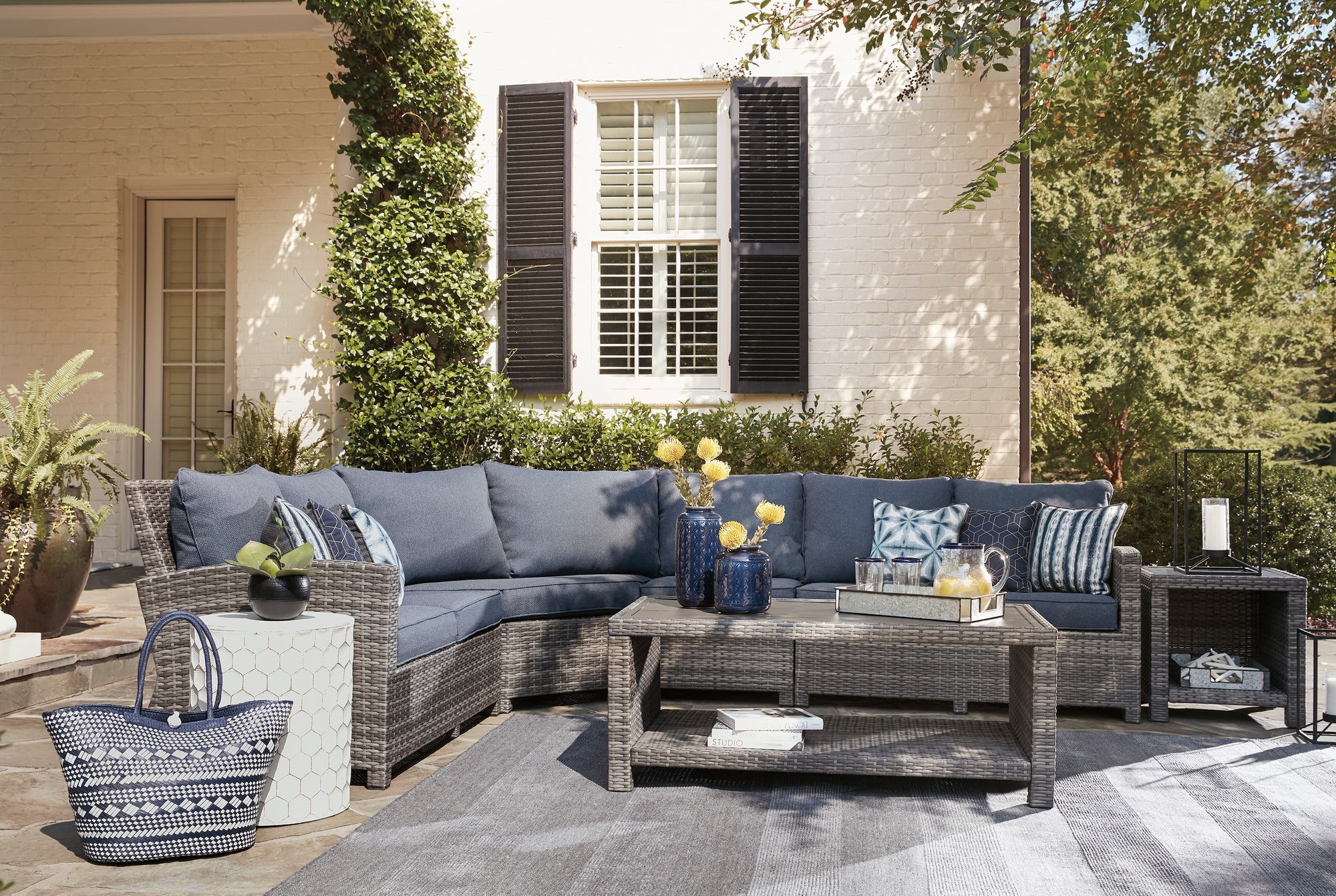 Create a coastal oasis with this 3-piece outdoor set. Handwoven resin wicker in gray with all-weather protection and Nuvella® fabric cushions. Water and stain resistant coffee table for carefree use.